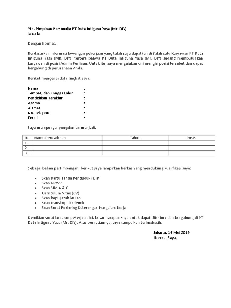 Ben Jobs Contoh Surat Lamaran Kerja Pdf Riwayat Hidup Surat Guru from i.pinimg.com Demikian surat lamaran kerja ini, saya berharap bapak/ibu mempertimbangan saya untuk bergabung dalam perusahaan ini. Max age 40 years send your cv and recent photograph: Membuat surat lamaran pekerjaan terbaru 2021 yang baik dan benar merupakan hal yang wajib dilakukan oleh para pencari kerja. Berikut ini admin akan bagikan informasi contoh surat lamaran kerja word pdf. Akibatnya sangat fatal, banyak yang tidak paham bagaimana cara menulis surat lamaran ini. Contoh surat lamaran kerja umum, bank, karyawan, alfamart, pt, sekolahan, formal, fresh graduate, bahasa inggris, via email, tulis surat lamaran kerja adalah surat yang digunakan untuk melakukan permohonan mendapatkan pekerjaan sesuai pengalaman pada perusahaan tertentu. Lebih parahnya lagi, ketika mengirimkan email lamaran juga sangat tidak. Hormat saya, (wiwik sudarno) diatas adalah salah satu dari contoh surat lamaran kerja via email yang baik dan benar, semogaa ada manfaatnya.